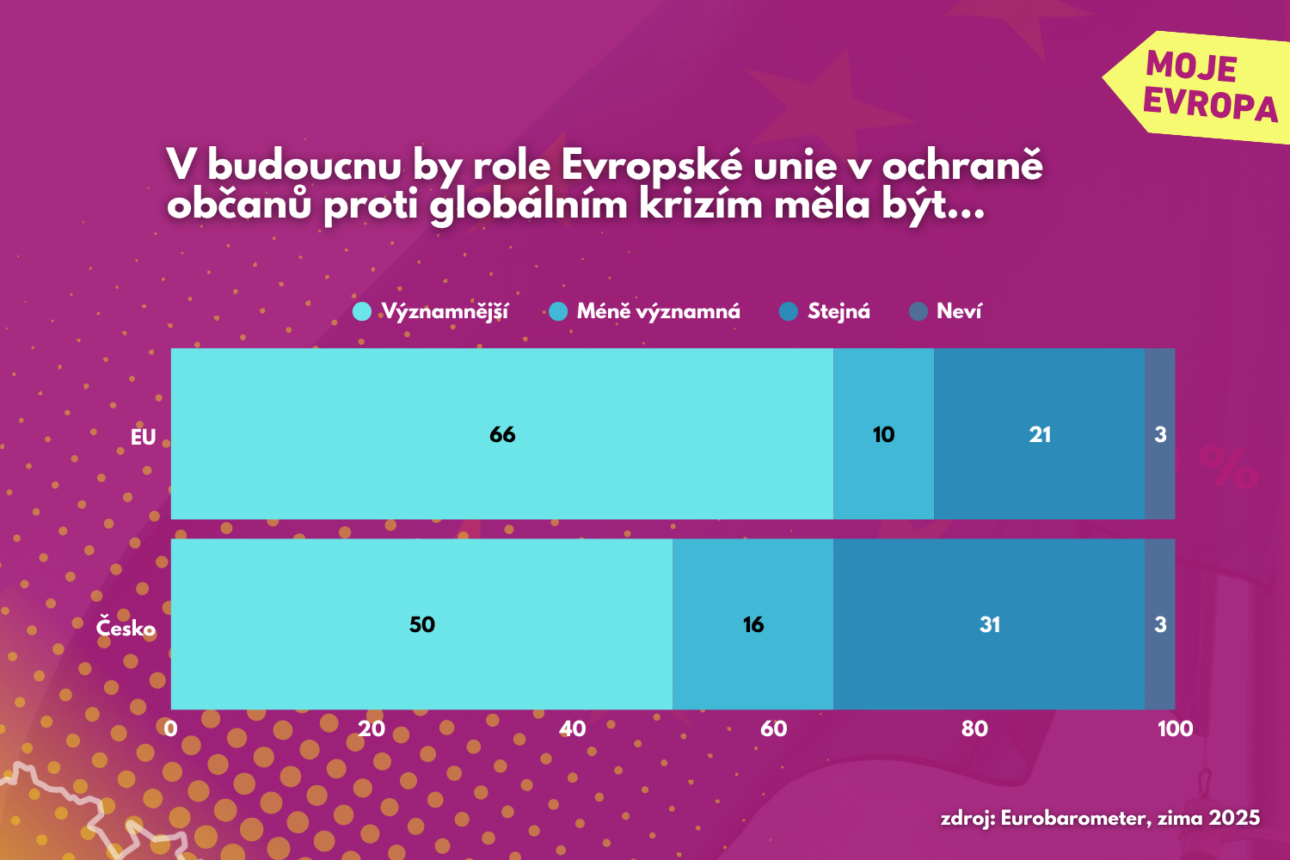 Data ukázala, že 66 procent Evropanů si myslí, že role EU by v oblasti ochrany obyvatel před globálními hrozbami měla v dalších letech růst. Češi zatím k téhle dvoutřetinové většině sice nemíří, nicméně i tak s tímto názorem souhlasí polovina lidí. A důležité je, že o tom, že by se měla role EU naopak snižovat, je přesvědčených jen 16 procent Čechů.