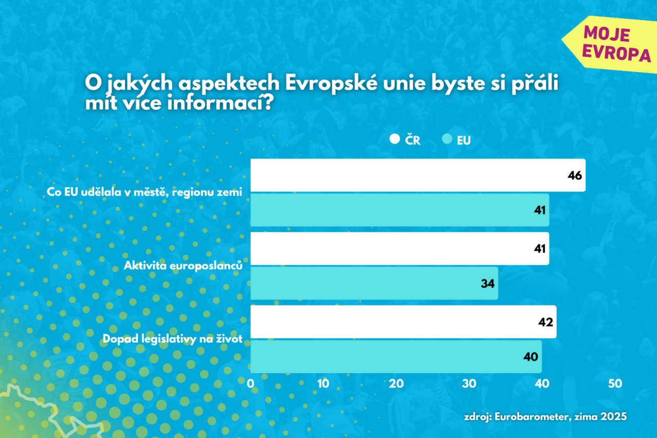 Průzkum ukázal, že je v Česku poměrně velká poptávka po informacích o tom, co Evropská unie „udělala“ v jejich městě, kraji, nebo v republice. Tedy jaké konkrétní a každodenní benefity jim přináší – že by o tento typ informací měli zájem, v průzkumu uvedlo 46 procent lidí, 42 procent lidí zajímají i konkrétní dopady evropské legislativy.